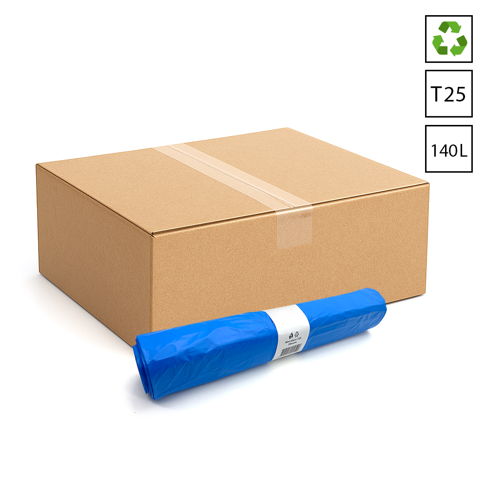 Blauwe afvalzakken met kwaliteit T25 gemaakt van Lagedichtheidpolyetheen (LDPE) zonder sluitlint. Deze grote vuilniszak met formaat 90×110 cm is sterk en het LDPE materiaal is na gebruik volledig te recyclen. Dit type afvalzak is ideaal voor het inzamelen van afvalstromen in afvalbakken of kleine containers. Geleverd in doos met 15×20 afvalzakken.