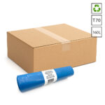 Blauwe 160 liter afvalzakken met kwaliteit T70 gemaakt van Lagedichtheidpolyetheen (LDPE) zonder sluitlint. Deze grote vuilniszak met formaat 90×110 cm is sterk en het LDPE materiaal is na gebruik volledig te recyclen. Dit type afvalzak is ideaal voor het inzamelen van afvalstromen in afvalbakken of kleine containers. Geleverd in doos met 25×20 afvalzakken.