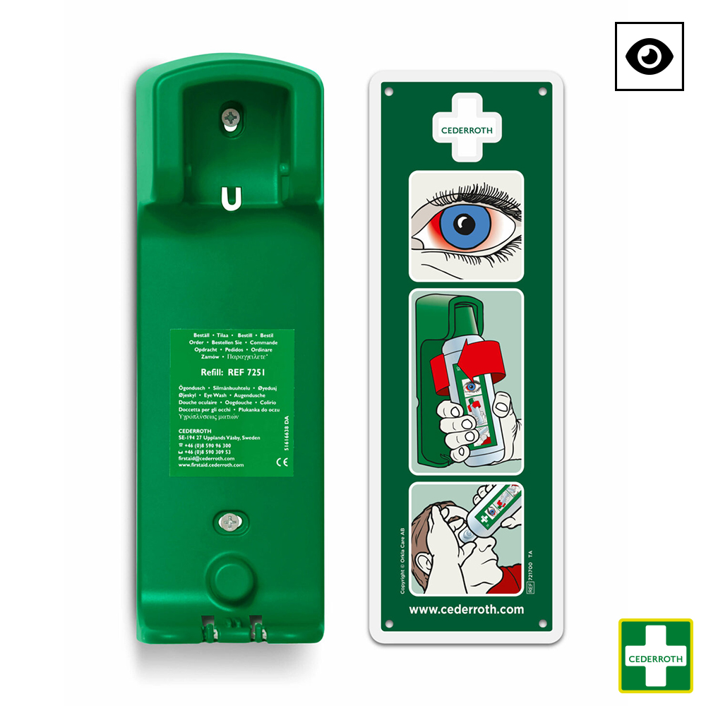 Cederroth 7200 wandhouder voor Cederroth 500 ml oogdouche flacons (725200). Bij het uitnemen wordt de oogspoelfles direct geopend, zo kun je direct beginnen met uitspoelen. Dit oogspoelstation kan op iedere gewenste locatie, wand of muur worden bevestigd voor het verlenen van eerste hulp. Bij deze houder is een luminescent instructiebord bijgevoegd met duidelijke gebruiksaanwijzingen.