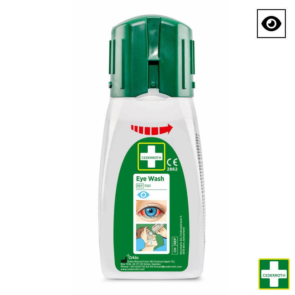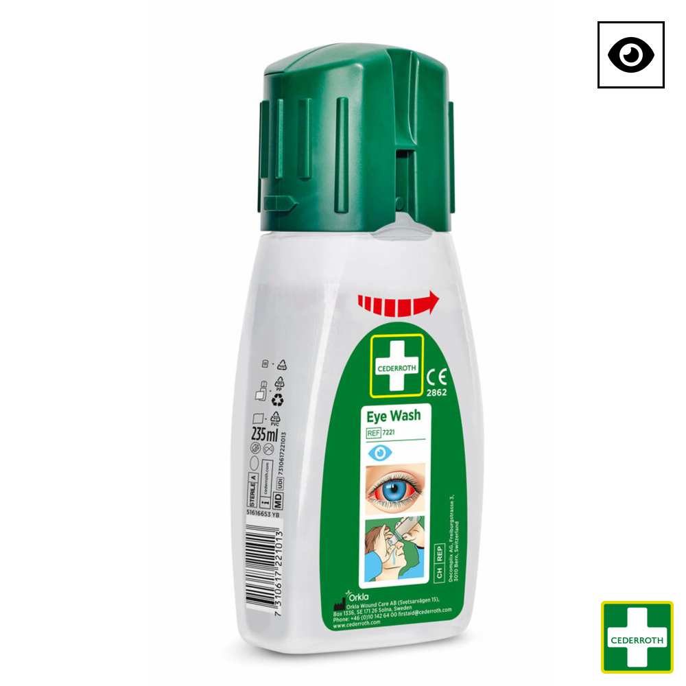 Cederroth 7221 oogdouche in 235 ml fles (zakformaat) met steriele gebufferde isotone keukenzoutoplossing koop je online bij de gespecialiseerde PBM-groothandel SafetyProducts.com. Al je oogspoelflessen en oogdouches razendsnel geleverd, altijd op voorraad.