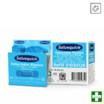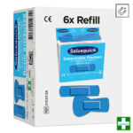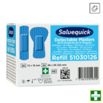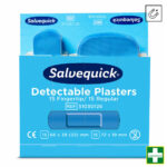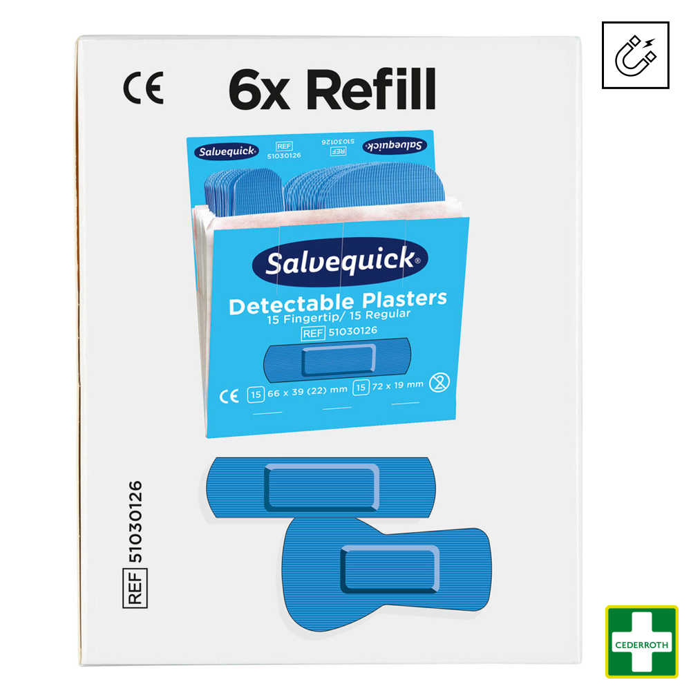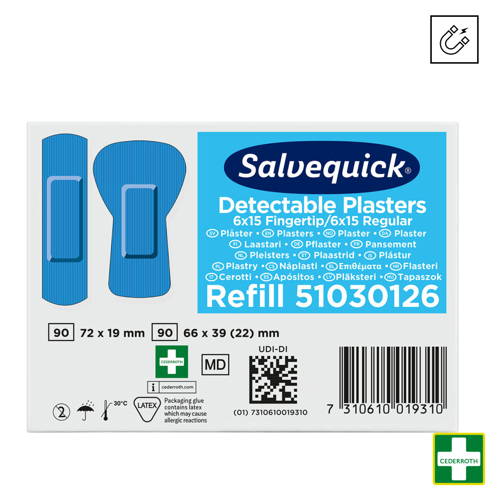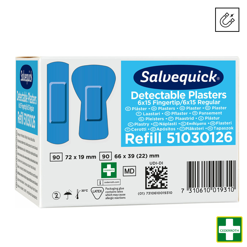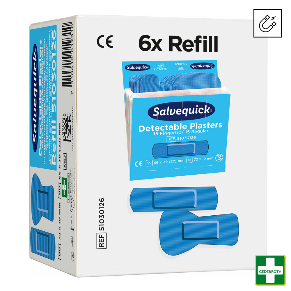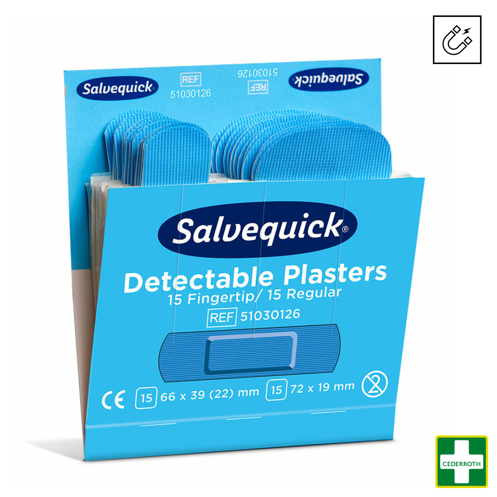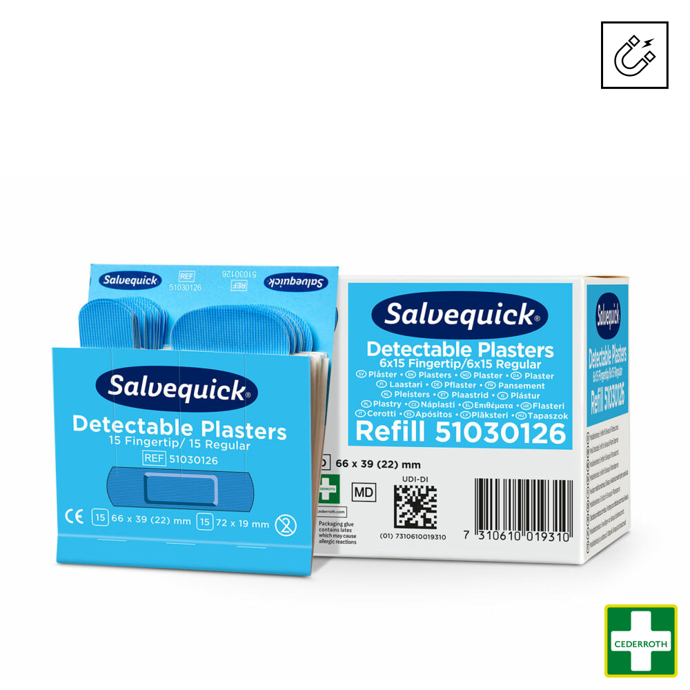 Cederroth Salvequick 51030126 blauwe metaal detecteerbare vingertop pleisters worden geleverd in 2 formaten. Deze navulling bevat 30 detecteerbare, waterproof pleisters: 15 pleisters van 63×39 mm en 15 pleisters van 72×19 mm. Onder het zachte wondkussen is een metaal detecteerbare aluminiumfolie aangebracht. De pleisters zijn gemaakt van flexibel polyurethaan en polystyreen, en zijn voorzien van een acrylaatkleefstof.