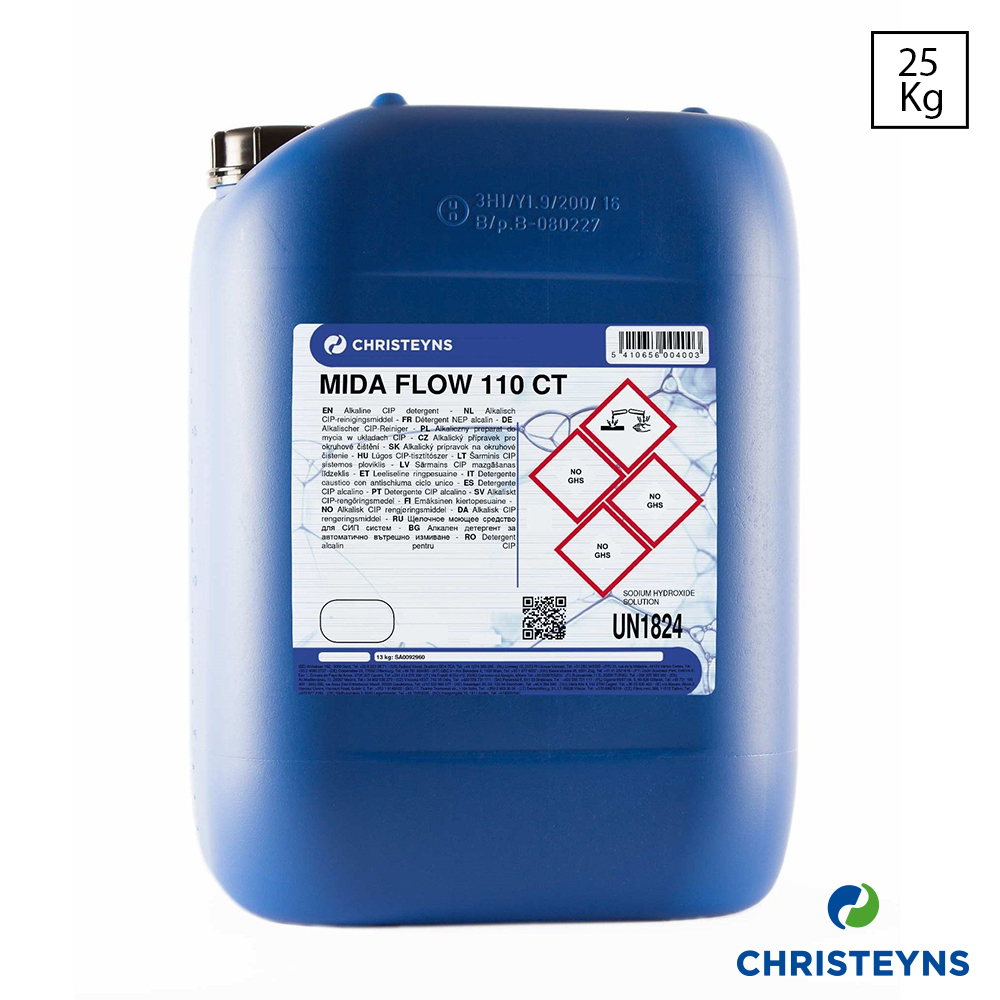 Christeyns MIDA FLOW 110 CT is een geconcentreerd, vloeibaar alkalisch CIP-reinigingsmiddel. MIDA Flow 110 CT is laagschuimend en speciaal ontwikkeld voor gebruik in Cleaning-in-Place-circuits in de voedingsindustrie. Het product is zeer geschikt voor het reinigen van tanks en leidingen en voor gebruik in mechanische wasinstallaties, maar ook voor werkmateriaal en machineonderdelen. Geleverd in jerrycans van 25 kg.