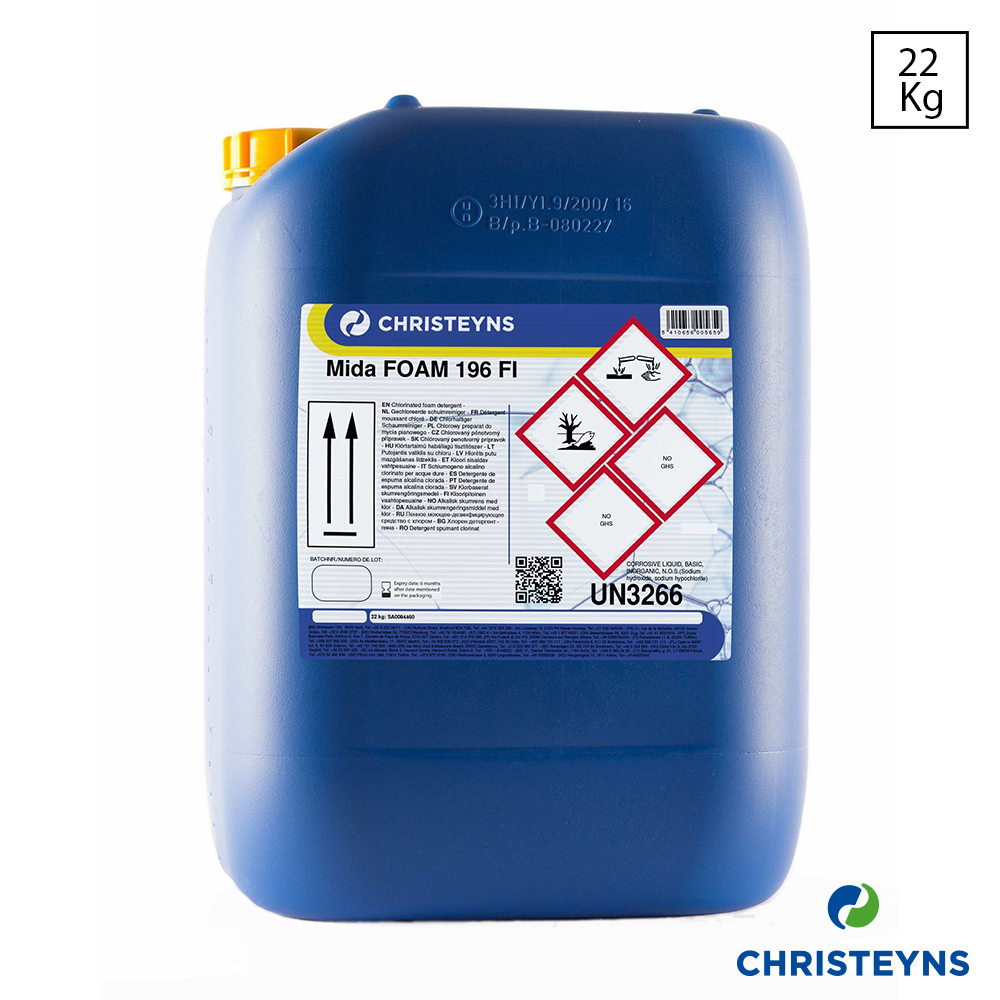 Christeyns MIDA FOAM 196 FI is een vloeibaar chloorhoudend alkalisch schuimreinigings- en desinfectiemiddel. Geschikt en toegelaten (NL 16112 N, BE 10415 B) voor gecombineerde reiniging en desinfectie van machines en oppervlakken in de voedingsindustrie. Heeft een krachtige werking op organische vervuilingen zoals vet, zetmeel, eiwitten, etc. en verwijderen van aanwezige verkleuringen. Geleverd in jerrycans van 22 kg.