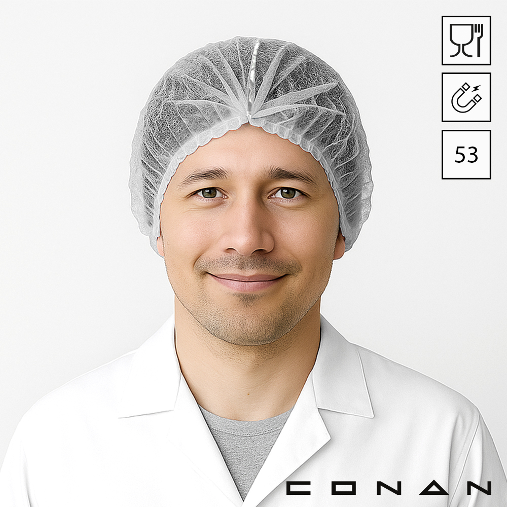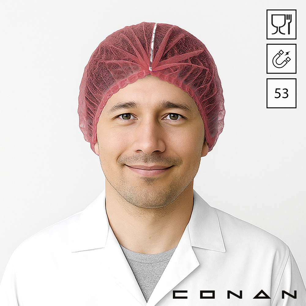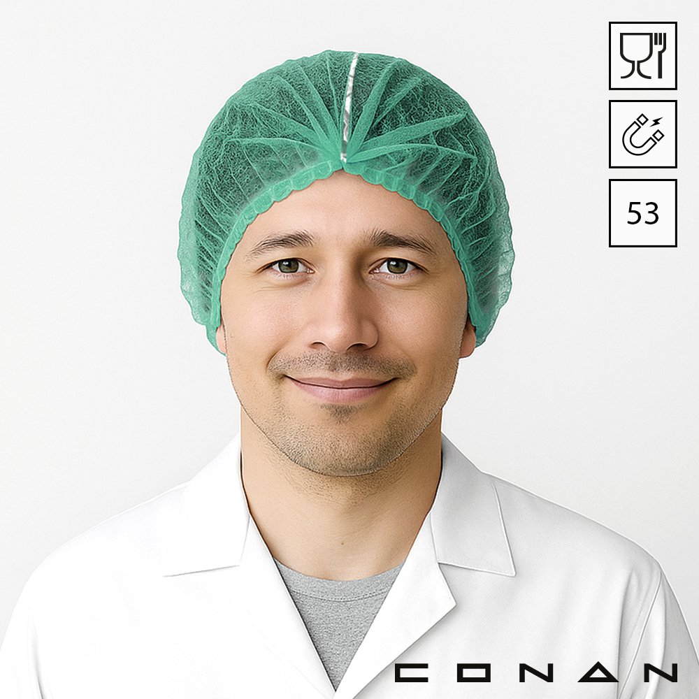 Conan 10-007 food grade metaal detecteerbare wokkel haarnetjes zijn gemaakt van non-woven Polypropeen. Conan haarnetjes met latex-vrij elastiek hebben een metalen strip die wordt herkend door detectiesystemen. Detecteerbare haarnetjes beschermen tegen uitvallend hoofdhaar en productvreemde delen. Deze wokkels zijn geschikt als dispenservulling en verkrijgbaar in 53 cm of 58 cm in 5 kleuren.
