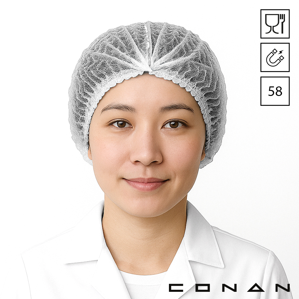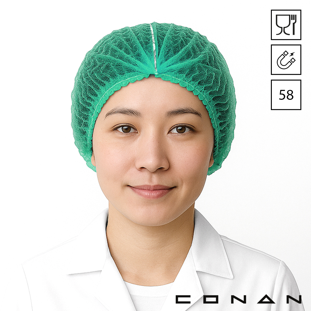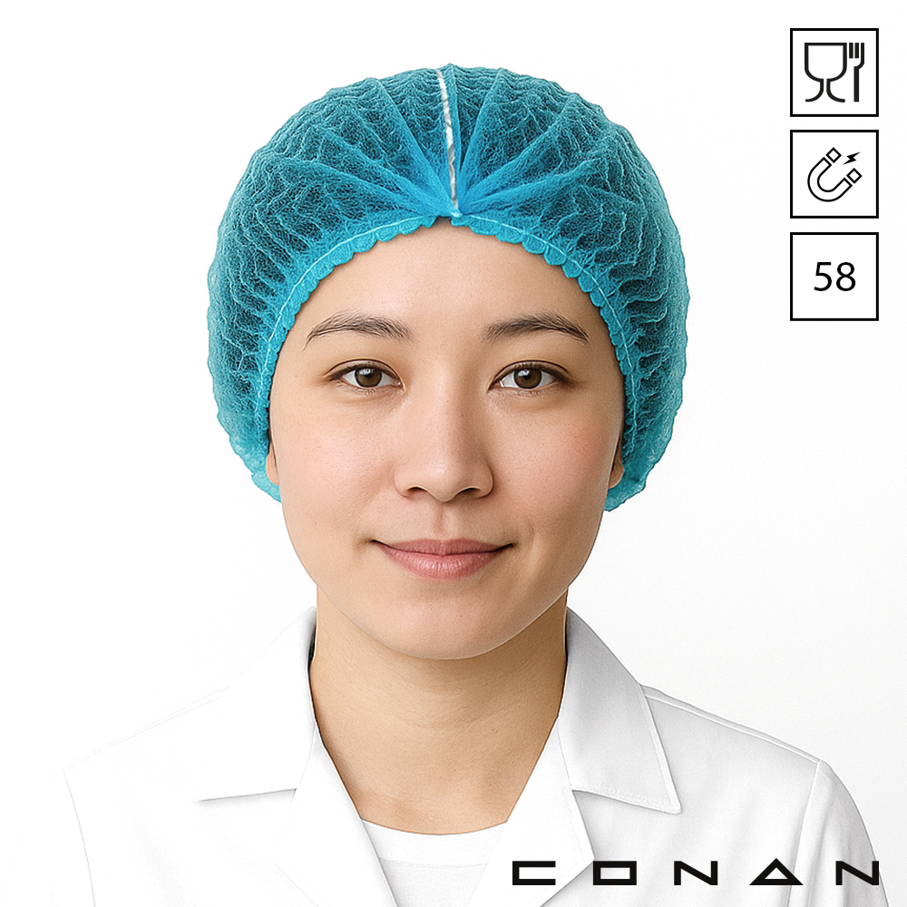 Conan 10-008 food grade metaal detecteerbare wokkel haarnetjes 58 cm zijn gemaakt van non-woven Polypropeen. Conan haarnetjes met latex-vrij elastiek hebben een metalen strip die wordt herkend door detectiesystemen. Detecteerbare haarnetjes beschermen tegen uitvallend hoofdhaar en productvreemde delen. Conan wokkels zijn geschikt als dispenservulling, verkrijgbaar in 4 kleuren en ook in 53 cm.