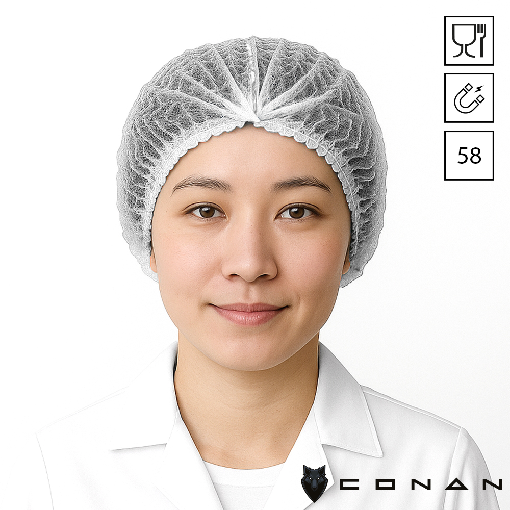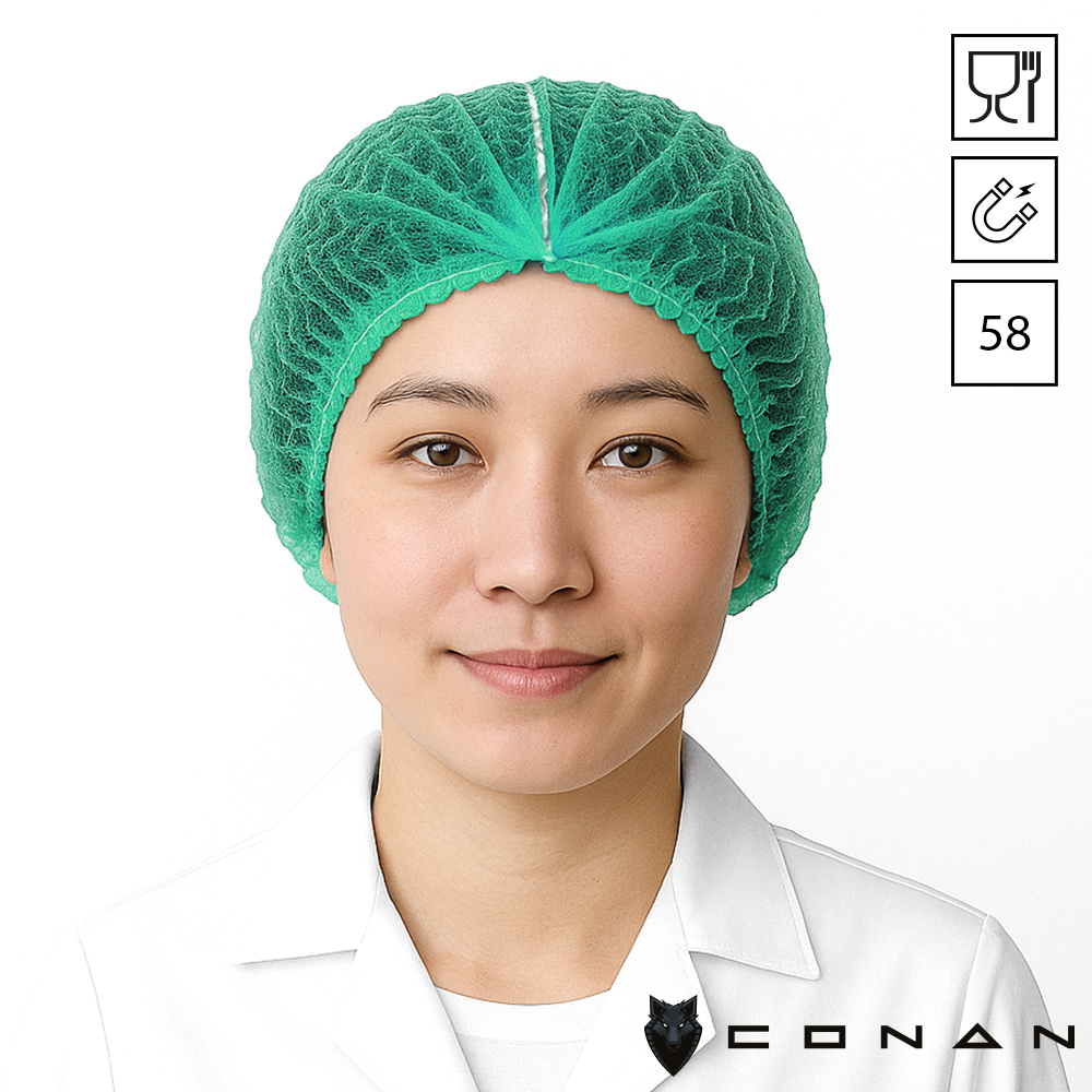 Conan 10-008 food grade metaal detecteerbare wokkel haarnetjes 58 cm zijn gemaakt van non-woven Polypropeen. Conan haarnetjes met latex-vrij elastiek hebben een metalen strip die wordt herkend door detectiesystemen. Detecteerbare haarnetjes beschermen tegen uitvallend hoofdhaar en productvreemde delen. Conan wokkels zijn geschikt als dispenservulling, verkrijgbaar in 4 kleuren en ook in 53 cm.