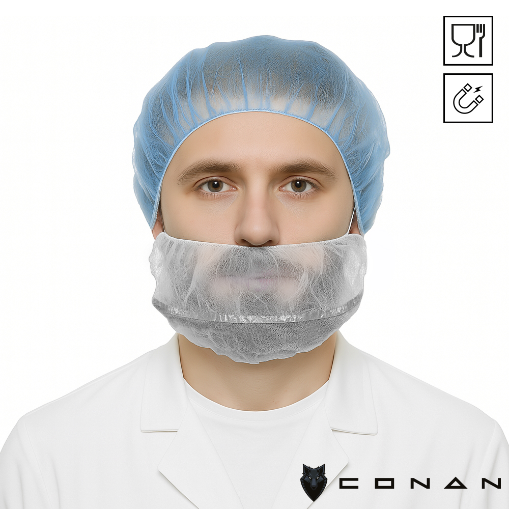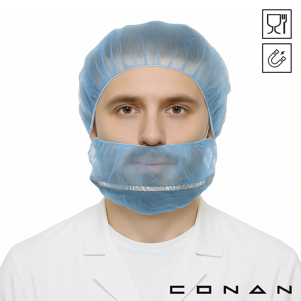 Conan10-018 food grade metaal detecteerbare baardmaskers gemaakt van non-woven Polypropeen. Dit voedselveilige baardnetje voorkomt dat snor- of baardharen terechtkomen in een hygiënische omgeving of proces. De toegevoegde metalen strip kan door detectieapparatuur worden gedetecteerd. Deze detecteerbare maskers met latex-vrije elastieken zijn verkrijgbaar in 2 kleuren.