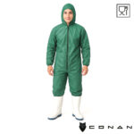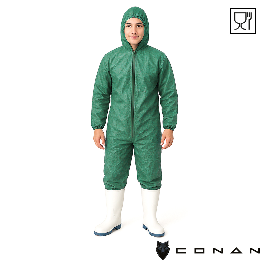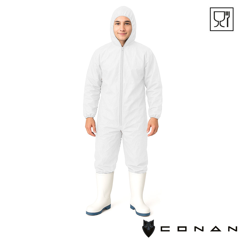 Met het dragen van food grade Conan 10-039 wegwerpoveralls: