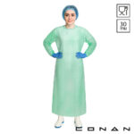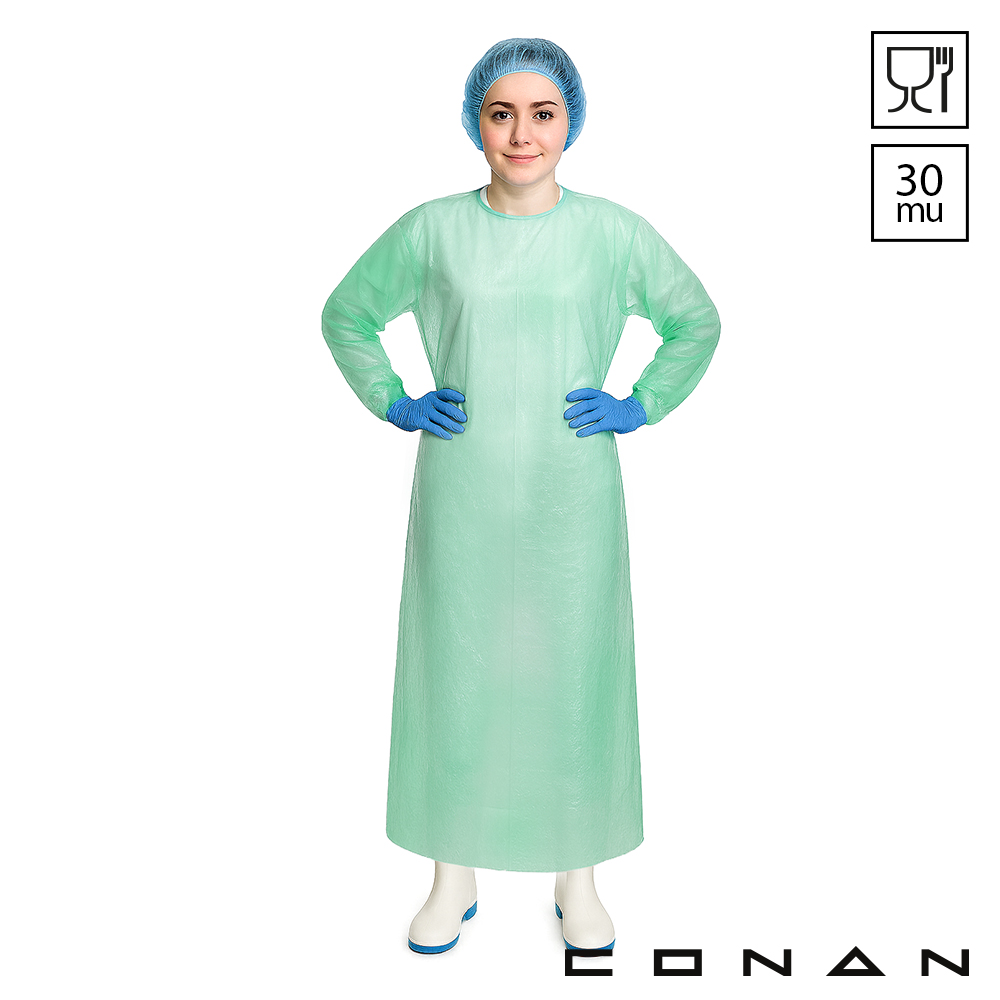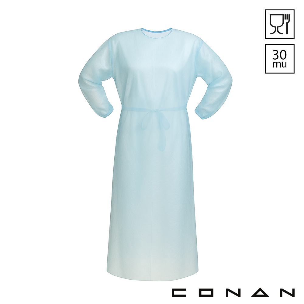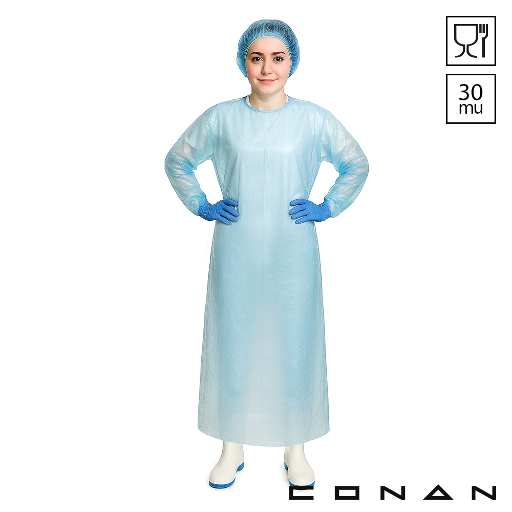 Conan 10-051 extra lange 118×190 cm CPE-schorten 30 mu met mouwen. Vloeistofdichte, hygiënische en food grade wegwerpschorten van Gechloreerd Polyethyleen met knooplint zijn per stuk verpakt en verkrijgbaar in 3 kleuren. Ze beschermen je kleding tegen vuil, vloeistof of spatten en zijn goedgekeurd voor contact met voedingsmiddelen. Daarnaast zijn ze ideaal voor kleurgecodeerde systemen.
