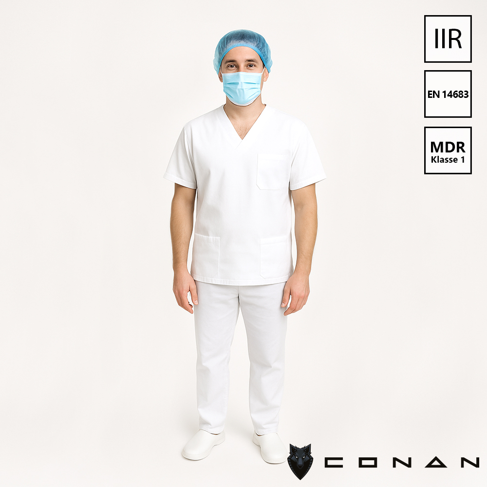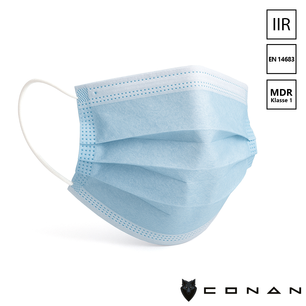 Conan 10-054 type IIR 3-laags mondmaskers zijn gemaakt van non-woven Polypropeen. Deze MDR Klasse 1 chirurgische mondmaskers bieden een bacteriële filter efficiency (BFE) van >99%. Dit hygiënische masker is voorzien van elastieken voor een comfortabele pasvorm en is vloeistofdicht. Conan 10-054 mondmaskers zijn voorzien van EN 14683 normering en geschikt voor eenmalig gebruik.