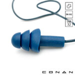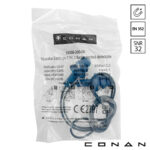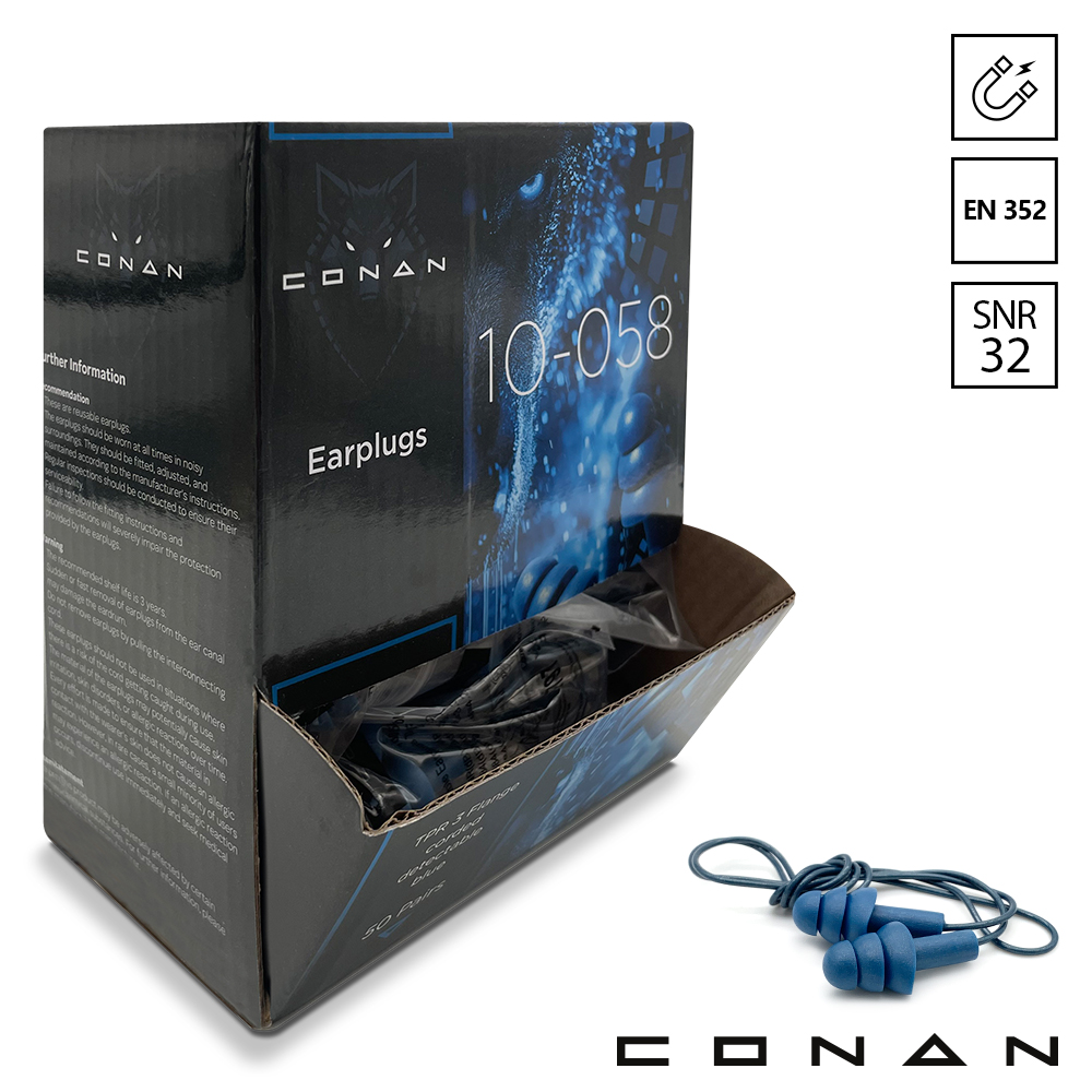 Conan 10-058 metaal detecteerbare TPR oordoppen met 3 lamellen en PVC koord. Betrouwbare gehoorbescherming (PBM) bedoeld voor meermalig gebruik die geluidsniveaus reduceert tot 32 dB. Deze blauwe oordoppen van thermoplastisch rubber met PVC koord passen in bijna elke gehoorgang. Separaat per paar verpakt in hersluitbare verpakking, geleverd in handige dispenserdoos met 50 paar oordoppen.