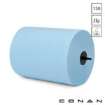 Conan 10-141 handdoekrollen matic dop met 2-laags blauw handdoekpapier op rol van 150 meter. Dit hoogabsorberende handdoekpapier is gemaakt van 100% cellulose en voorzien van het EU Ecolabel. Ideaal voor sanitaire ruimtes, zoals toiletten en wasruimtes, waar hygiëne en efficiënt gebruik belangrijk zijn. Speciaal ontwikkeld voor matic-dispensersystemen en geleverd per pak van 6 rollen.