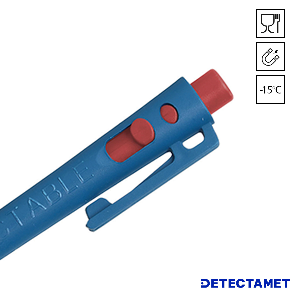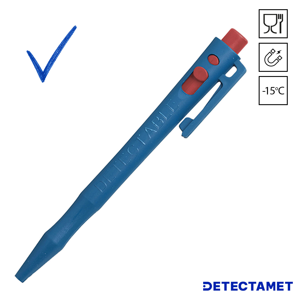 Blauwe Detectamet detecteerbare Cryo HD intrekbare pen met clip en blauwe cryo inkt. De inkt van deze voedselveilige metaal- en röntgen detecteerbare Cryo HD-pen is bestand tegen extreem koude tempraturen. Hij is geschikt voor food contact en voldoet aan de FDA en BRCGS voedselveiligheid standaard. Zowel de praktisch onbreekbare polymeerbehuizing als het inktpatroon zijn detecteerbaar. Dit is de veiligste pen voor de voedings- en farmaceutische industrie.