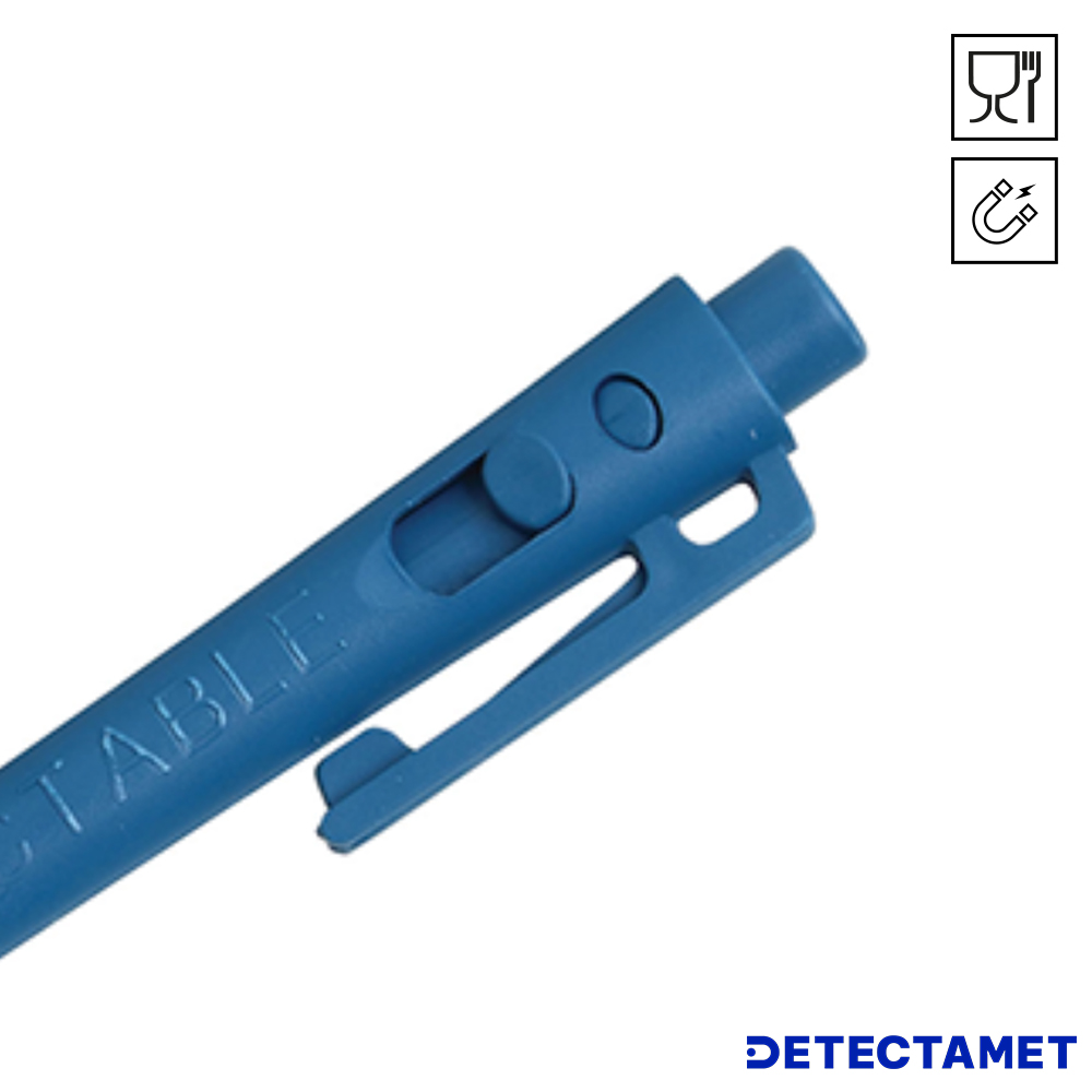 Blauwe Detectamet detecteerbare HD intrekbare pen met clip en normale blauwe inkt. Deze voedselveilige metaal- en röntgen detecteerbare HD-pennen zijn geschikt voor contact met voedingsmiddelen en voldoen aan de FDA en BRCGS foodveiligheidsstandaard. Zowel de praktisch onbreekbare polymeerbehuizing als het inktpatroon zijn detecteerbaar. Dit is de veiligste pen voor de voedings- en farmaceutische industrie.