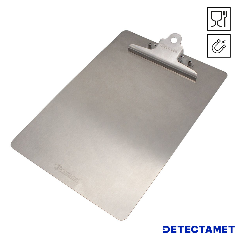 Detectamet volledig roestvrijstalen detecteerbaar klembord in A4-formaat is uitgerust met een zware RVS-klem. Dit klembord is volledig metaal- en röntgen detecteerbaar en voorzien van een stevige roestvrijstalen klem die het papier stevig op zijn plaats houdt. Zowel het bord als de klem zijn detecteerbaar en ideaal voor gebruik in (voedsel)veilige toepassingen binnen de farmaceutische en voedingsindustrie.