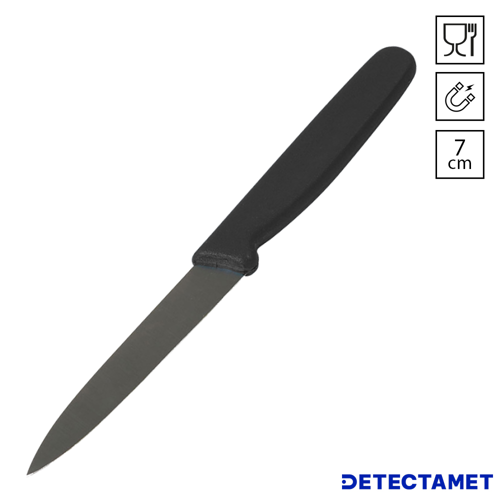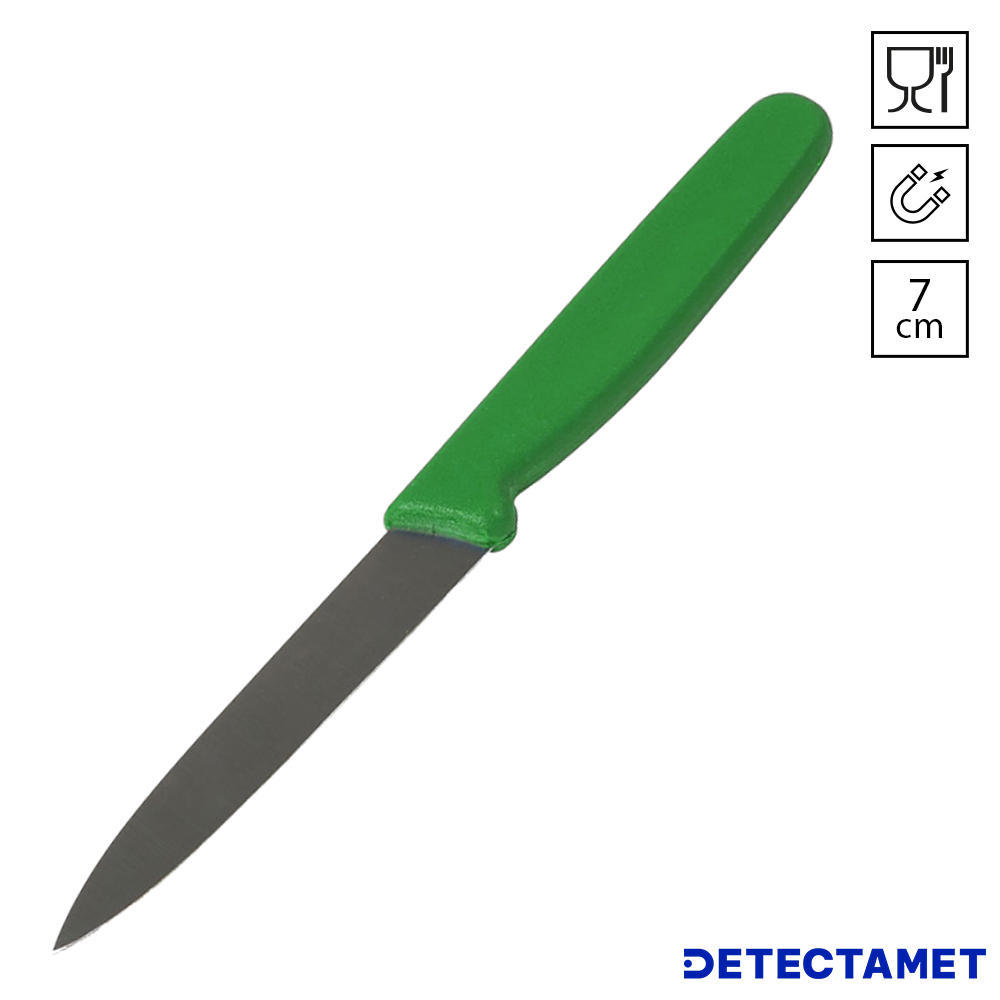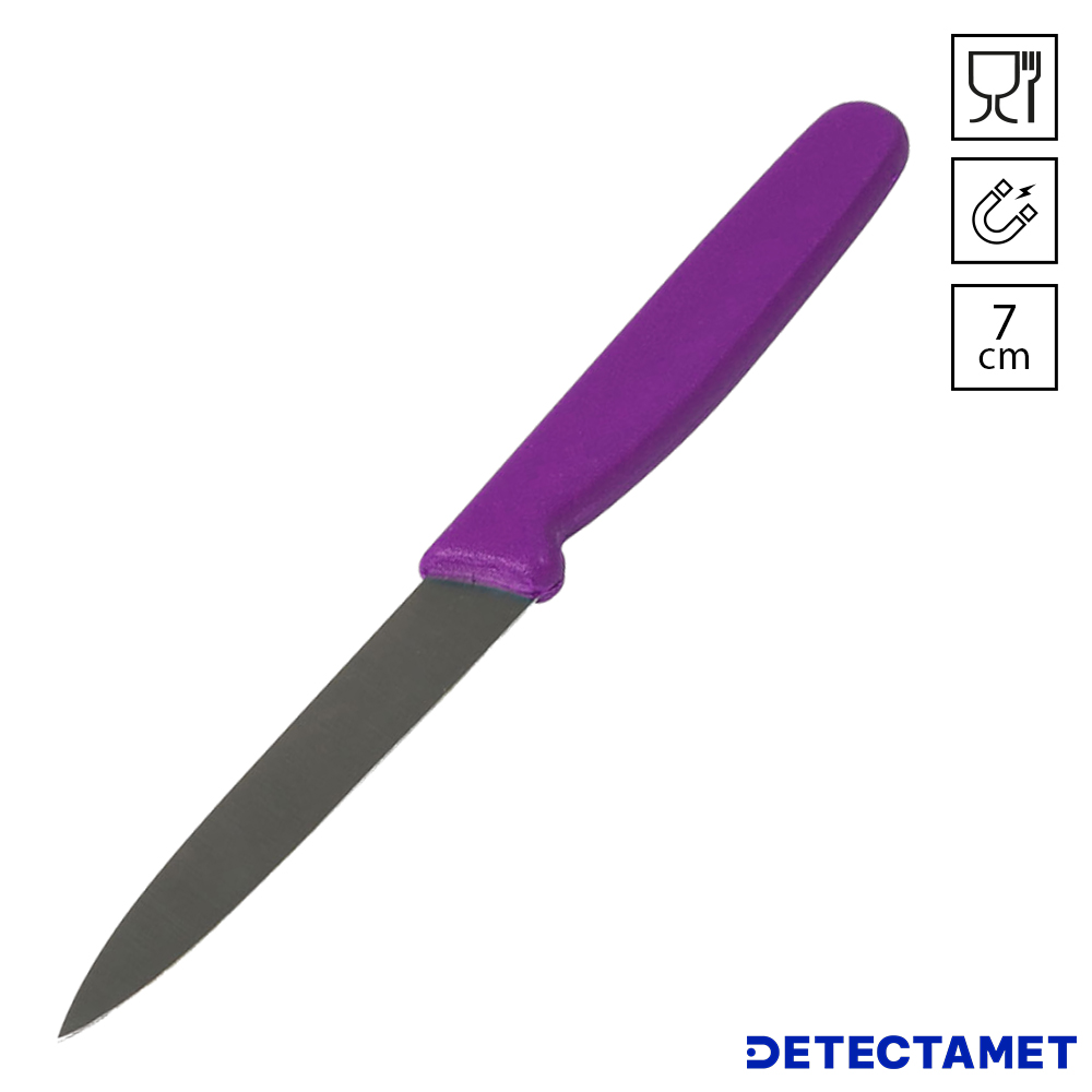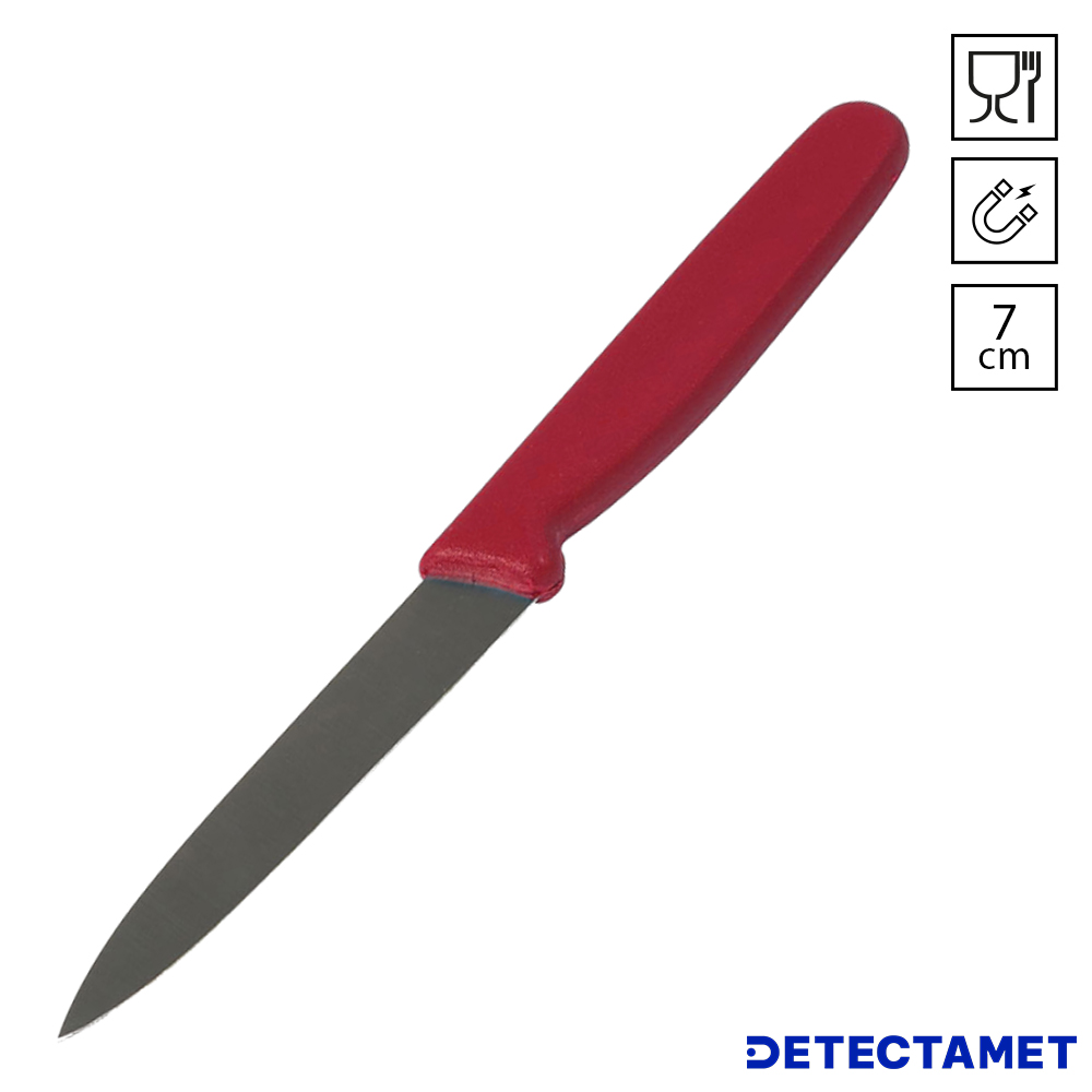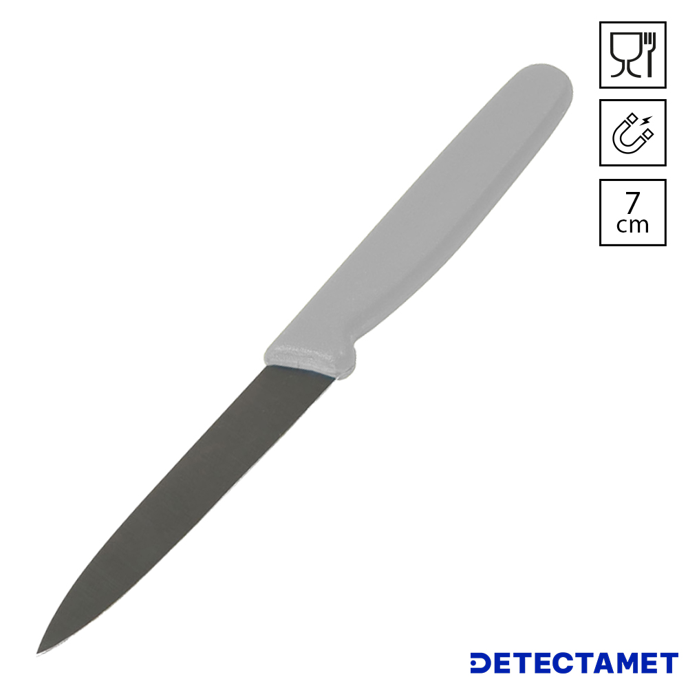 De Detectamet detecteerbare schilmesjes hebben een recht lemmet van 7 cm. Dit type mes is gemaakt van gehard en getemperd roestvrij staal (Sheffield Steel) met een food grade polymeer handvat. Zowel de kunststof greep als het roestvrijstalen mes zijn metaal- en röntgen detecteerbaar. Dit food grade en FDA-goedgekeurde schilmes is per stuk verkrijgbaar in 8 verschillende kleuren, ideaal voor kleurcodering.