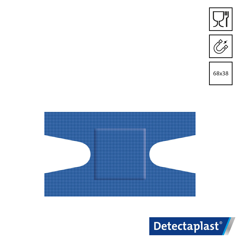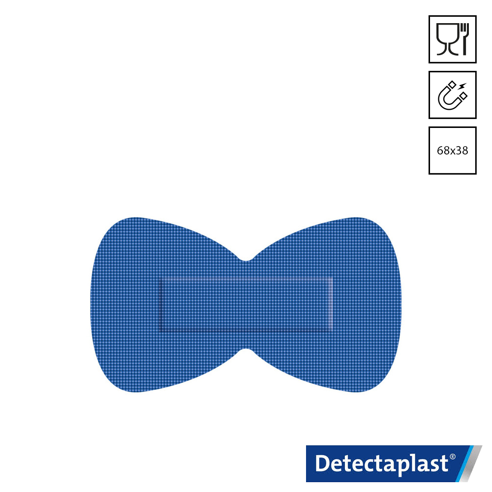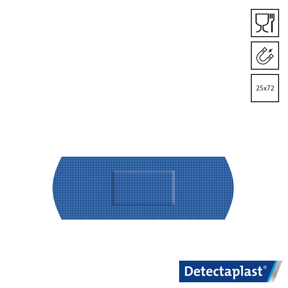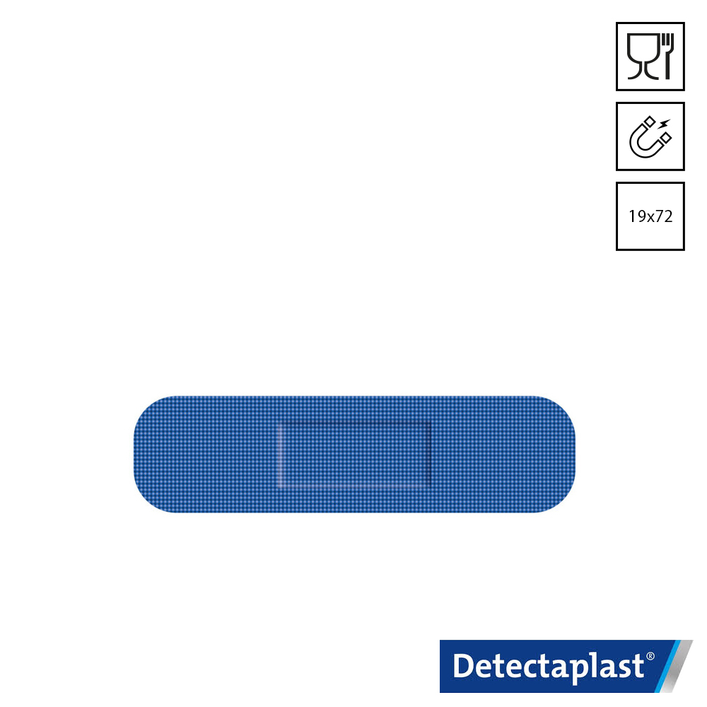 De blauwe Detectaplast Super Stretch 8142E metaal detecteerbare assorti set bevat pleisters met 4 verschillende formaten. Deze visueel-, metaal- en röntgen (X-ray) detecteerbare textielpleisters zijn ideaal voor gebruik op hygiënische locaties, zoals in de voedingsindustrie. De Detectaplast 8142E-pleisters, met aluminiumfolie onder het wondkussen, zijn voorzien van hypoallergene lijm. Ze zijn latexvrij en voldoen aan de HACCP-, IFS- en BRC-standaarden.