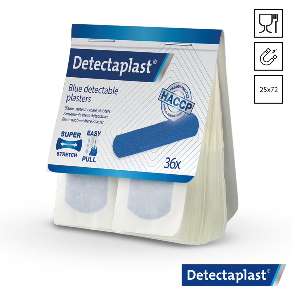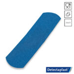 Blauwe Detectaplast 8241PD.5 Super Stretch Tear & Wear metaal detecteerbare pleisters met formaat 25×72 mm. Deze visueel en elektromagnetisch detecteerbare pleisters in 5 hygiënische Easy-Pull verpakkingen met elk 36 pleisters zijn dispensergeschikt. Deze textiele pleisters zijn ideaal voor gebruik op hygiënische locaties, zoals in de voedingsindustrie. Detectaplast 8241PD.5 Super Stretch pleisters zijn zeer comfortabel en geschikt voor bewegende lichaamsdelen.
