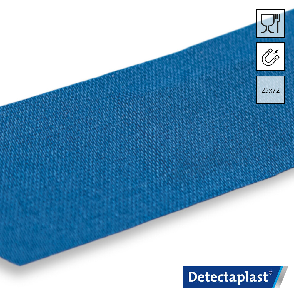 - Blauwe metaal detecteerbare Tear & Wear textiel pleisters 25×72 mm.