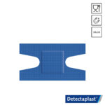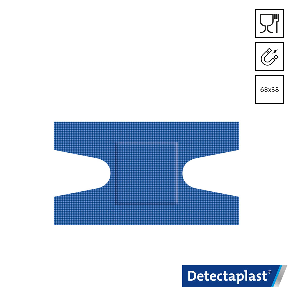 Blauwe Detectaplast Super Stretch 8246 metaal detecteerbare kneukel pleisters met een formaat van 68×38 mm. Deze visueel en elektromagnetisch detecteerbare pleisters van textiel zijn ideaal voor gebruik op hygiënische locaties, zoals in de voedingsindustrie. De Detectaplast 8246-pleisters met aluminiumfolie onder het wondkussen zijn voorzien van hypoallergene lijm. Ze zijn latexvrij en voldoen aan de HACCP-, IFS- en BRC-standaarden.