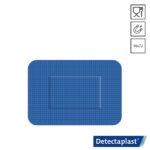 Blauwe Detectaplast Super Stretch 8251 metaal detecteerbare pleisters met een formaat van 50×72 mm. Deze visueel en elektromagnetisch detecteerbare pleisters van textiel zijn ideaal voor gebruik op hygiënische locaties, zoals in de voedingsindustrie. De Detectaplast 8251-pleisters met aluminiumfolie onder het wondkussen zijn voorzien van hypoallergene lijm. Ze zijn latexvrij en voldoen aan de HACCP-, IFS- en BRC-standaarden.