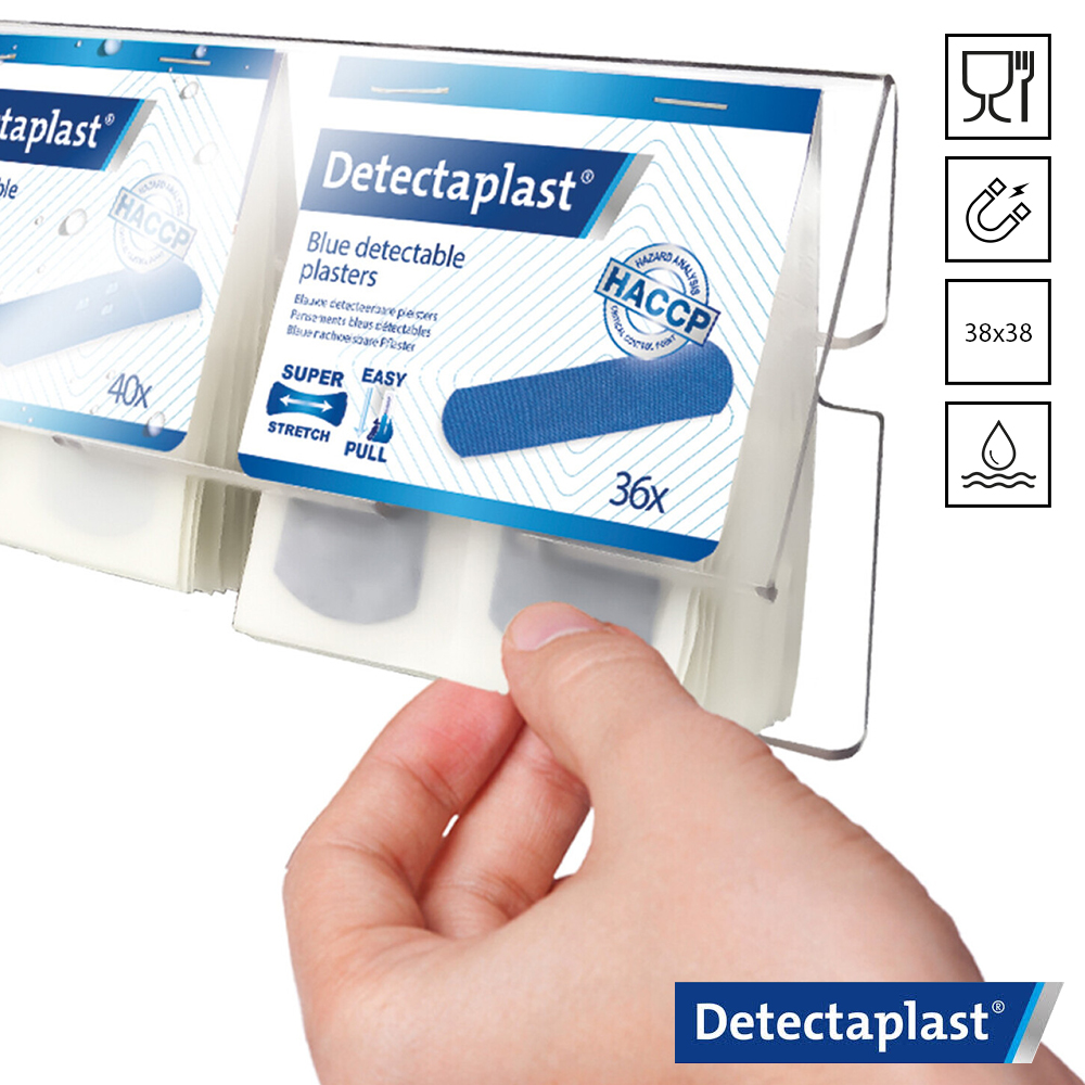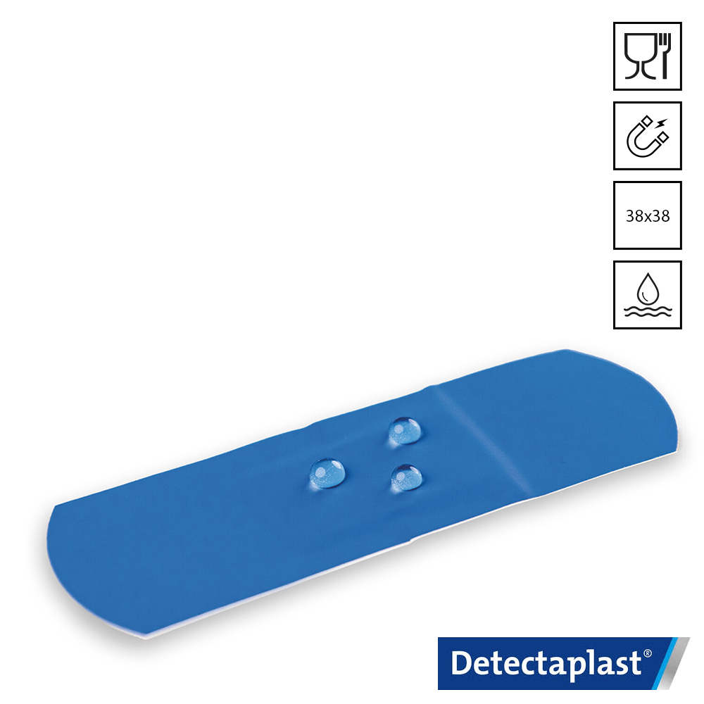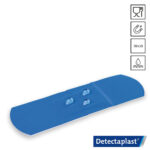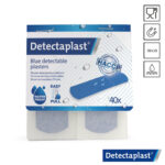 Blauwe Detectaplast Tear & Wear 8141PD.5 waterproof en metaal detecteerbare PE pleisters 25×72 mm. Deze visueel en elektromagnetisch detecteerbare blauwe pleisters zijn geschikt voor dispensers en gebruik op hygiënische locaties en in de voedingsindustrie. Elke Easy-Pull verpakking bevat 40 pleisters. Alle pleisters zijn latexvrij, water- en vuilafstotend, geven niet af en voldoen aan de HACCP-, IFS- en BRC-standaarden.