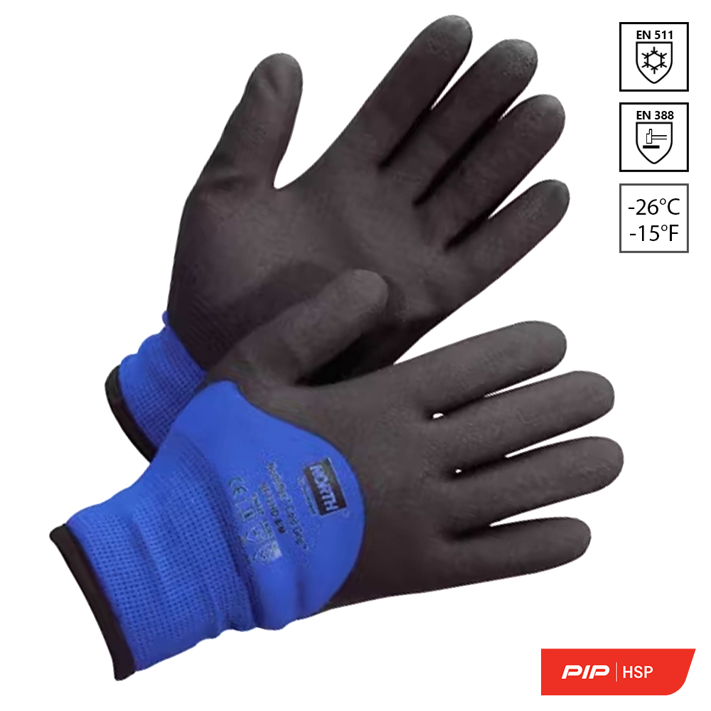Honeywell NorthFlex Cold Grip NF11HD blauw-zwarte koudebestendige werkhandschoenen met mechanische handbescherming (EN 388). De Cold Grip-handschoen beschermt je tegen extreem lage temperaturen (tot -26°C) volgens EN 511. De zachte, flexibele PVC-schuimcoating op handpalm en vingers absorbeert schokken en trillingen. Daarnaast bieden ze een uitstekende grip, zelfs bij koude en vochtige omstandigheden.