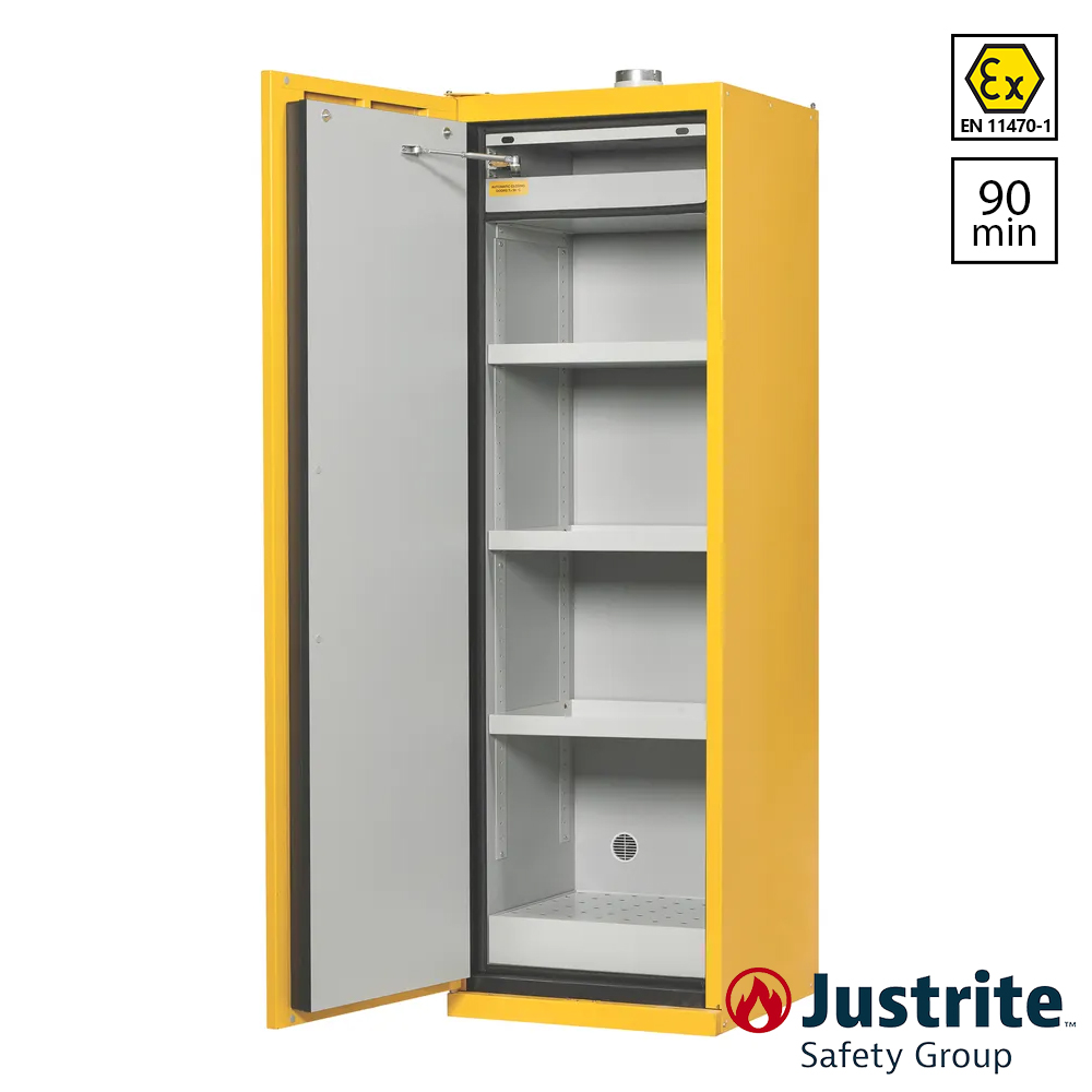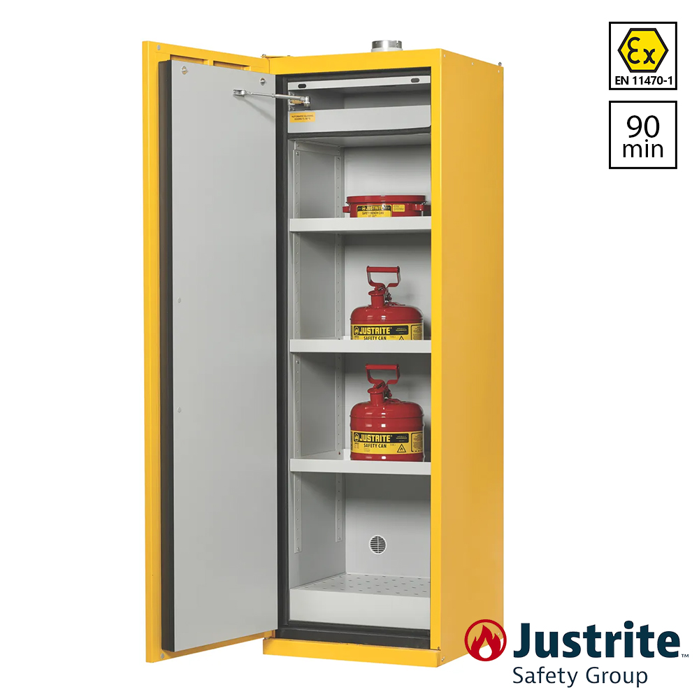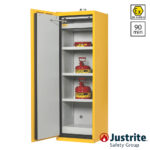 Gele Justrite JCB22608YL brandwerende veiligheidskast met enkele deur voor ontvlambare vloeistoffen en chemicaliën. Deze EN gecertificeerde opslagkast biedt een extreme brandwerendheid van 90 minuten volgens de EN 14470-1 norm. De kast is vervaardigd uit 1,0 – 1,5 mm elektrolytisch verzinkt staal met een robuuste, zuurbestendige epoxy-gecoate buitenkant voor een uitstekende corrosiebestendigheid.