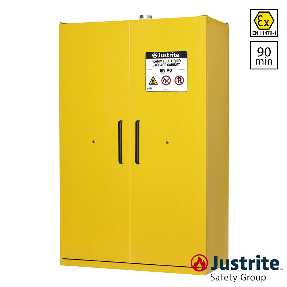 Gele Justrite JCB22609YL brandwerende veiligheidskast met dubbele deuren voor ontvlambare vloeistoffen en chemicaliën. Deze EN gecertificeerde opslagkast biedt een extreme brandwerendheid van 90 minuten volgens de EN 14470-1 norm. De kast is vervaardigd uit 1,0 – 1,5 mm elektrolytisch verzinkt staal met een robuuste, zuurbestendige epoxy-gecoate buitenkant voor een uitstekende corrosiebestendigheid.