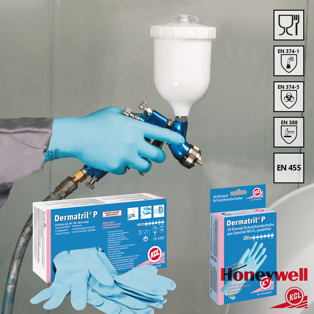 De blauwe KCL Dermatril P 743 disposable nitril handschoenen met ruw gecoate vingertoppen. Deze veelzijdige wegwerphandschoen is food grade gecertificeerd, chemisch bestendig, biedt bescherming tegen virussen en is tevens geschikt als medisch hulpmiddel (EN 455). De Dermatril P 743 heeft een hoge tastgevoeligheid, bevat geen siliconen of latex en is bestand tegen een breed scala aan cytostatica.