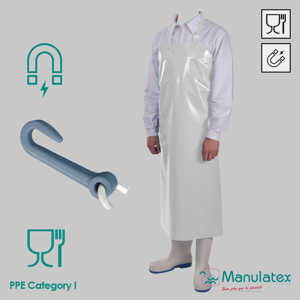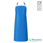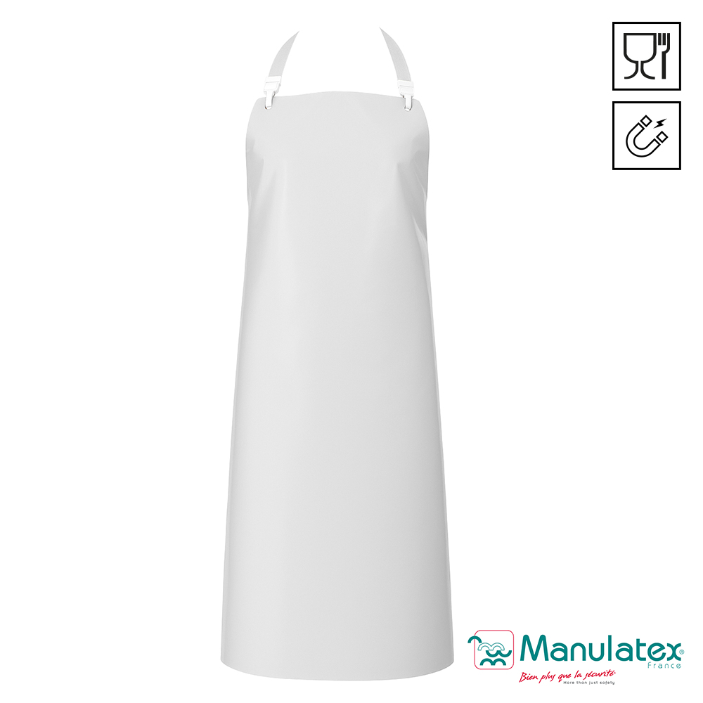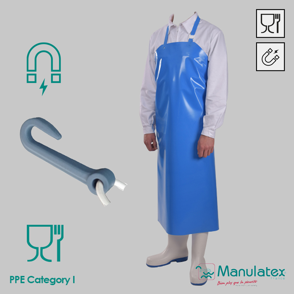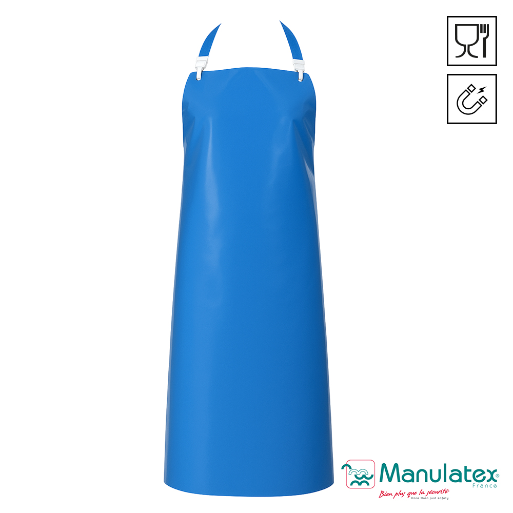 Food grade Manulatex DELTA-werkschorten 90×115 cm gemaakt van 300 mu Polyurethaan. Deze lange gladde slagersschorten (PBM) zijn vloeistofdicht, volledig metaal vrij en zijn voorzien van thermisch gelaste oogjes. Dit polyurethaanschort met metaal detecteerbare kunststof haak en heeft een hoge bestendigheid tegen dierlijke vetten, bloed, gangbare reinigingsmiddelen en verhardt niet. Hoge kwaliteit slachtschort.