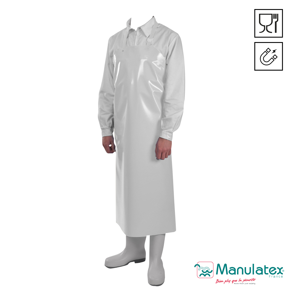 Food grade Manulatex DELTA-werkschorten 90×115 cm gemaakt van 300 mu Polyurethaan. Deze lange gladde slagersschorten (PBM) zijn vloeistofdicht, volledig metaal vrij en zijn voorzien van thermisch gelaste oogjes. Dit polyurethaanschort met metaal detecteerbare kunststof haak en heeft een hoge bestendigheid tegen dierlijke vetten, bloed, gangbare reinigingsmiddelen en verhardt niet. Hoge kwaliteit slachtschort.