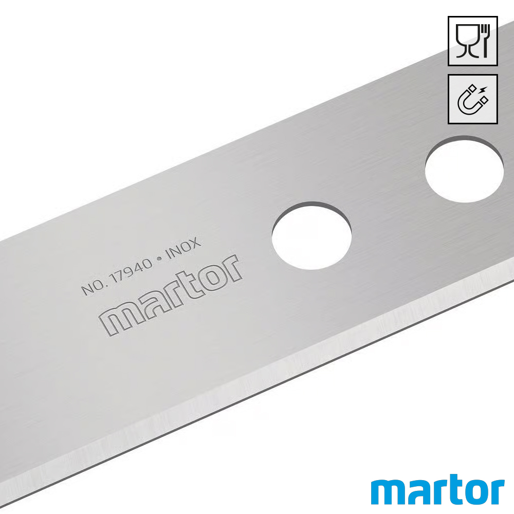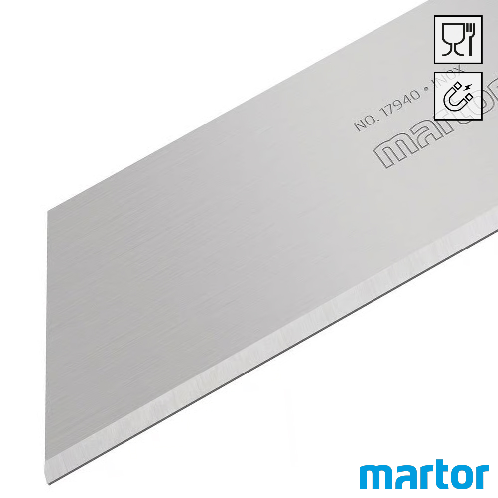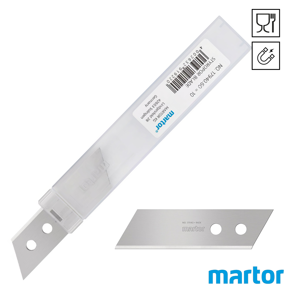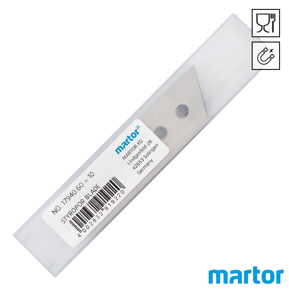 Martor Styropor mesjes nr. 17940 zijn gemaakt van hoogwaardig roestvrij staal (Inox). Deze vlijmscherpe RVS mesjes met dubbel snijvalk zijn food safe en worden geleverd per doos met 10 dispenser-cassettes. Elke cassette bevat 10 vervangingsmesjes en zijn compatibel met verschillende Martor veiligheidsmessen. 17940 mesjes zijn zowel metaal- als X-ray detecteerbaar en hierdoor ideaal voor de voedingsindustrie.