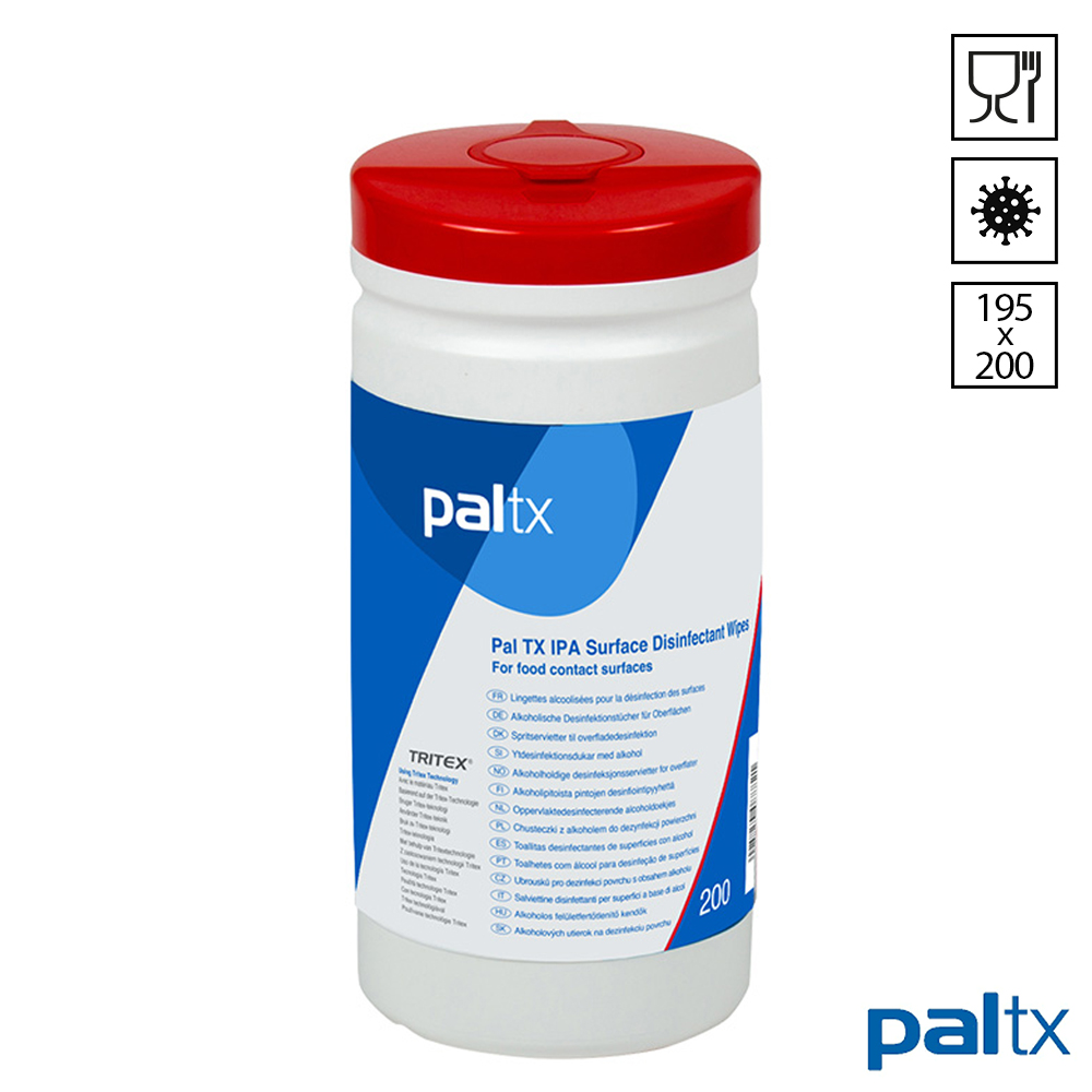 PALtx IPA desinfectie wipes op basis van 70% Isopropyl alcohol voor voedselveilige desinfectie van oppervlakken. PALtx IPA Surface Desinfectant wipes zijn virus- en bacterie dodend en verkrijgbaar in tubes met 200 wipes of dispenseremmers met 1000 wipes. Ze bevatten geen ethanol, Quat en PHMB. Deze food wipes met formaat 195×200 mm zijn gemaakt van Tritex-materiaal en de best verkrijgbare desinfectiedoekjes voor de voedingsindustrie.
