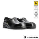 Sika Footwear 19476 Fusion Clog ESD zwarte en witte S2 veiligheidsklompen. Deze superlichte hygiënische foodklomp met stalen neus heeft een dichte hiel en SRB antislipzool. De Sika 19476 heeft een ademende vervangbare antibacteriële inlegzool die wasbaar is op 30°C. Het slijtvaste Permair lederen bovenwerk is waterafstotend terwijl de PU zool schokken absorbeert tijdens het lopen.