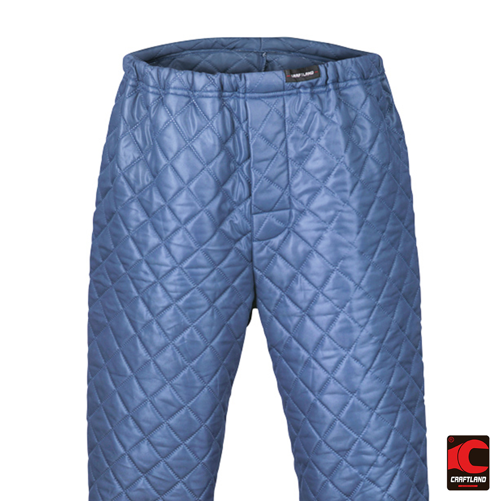 Thermobroek Craftland Turku is een warmte-isolerende marineblauwe broek met ruitpatroon en lange broekspijpen. Zowel de vulling als de buitenstof van deze lichte thermobroek zijn gemaakt van 100% polyester (250 g/m²). De Craftland Turku met reach-through fly-gulpopening houdt het onderlichaam lekker warm op gekoelde locaties, tijdens transport en onder koude omstandigheden.