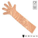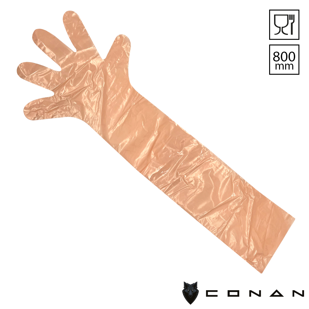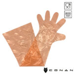 Disposable 80 cm lange veterinaire handschoenen gemaakt van oranje gekleurd Lage Dichtheid Polyetheen (LDPE). Dit is een betrouwbare vloeistofdichte handschoen die veel wordt gebruikt in de dierengeneeskunde en door veeartsen. Daarnaast is deze gladde handschoen voor linker- of rechterhand food grade gecertificeerd en beschermt je hand en arm helemaal tot aan je schouder.