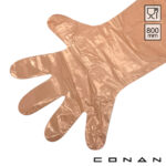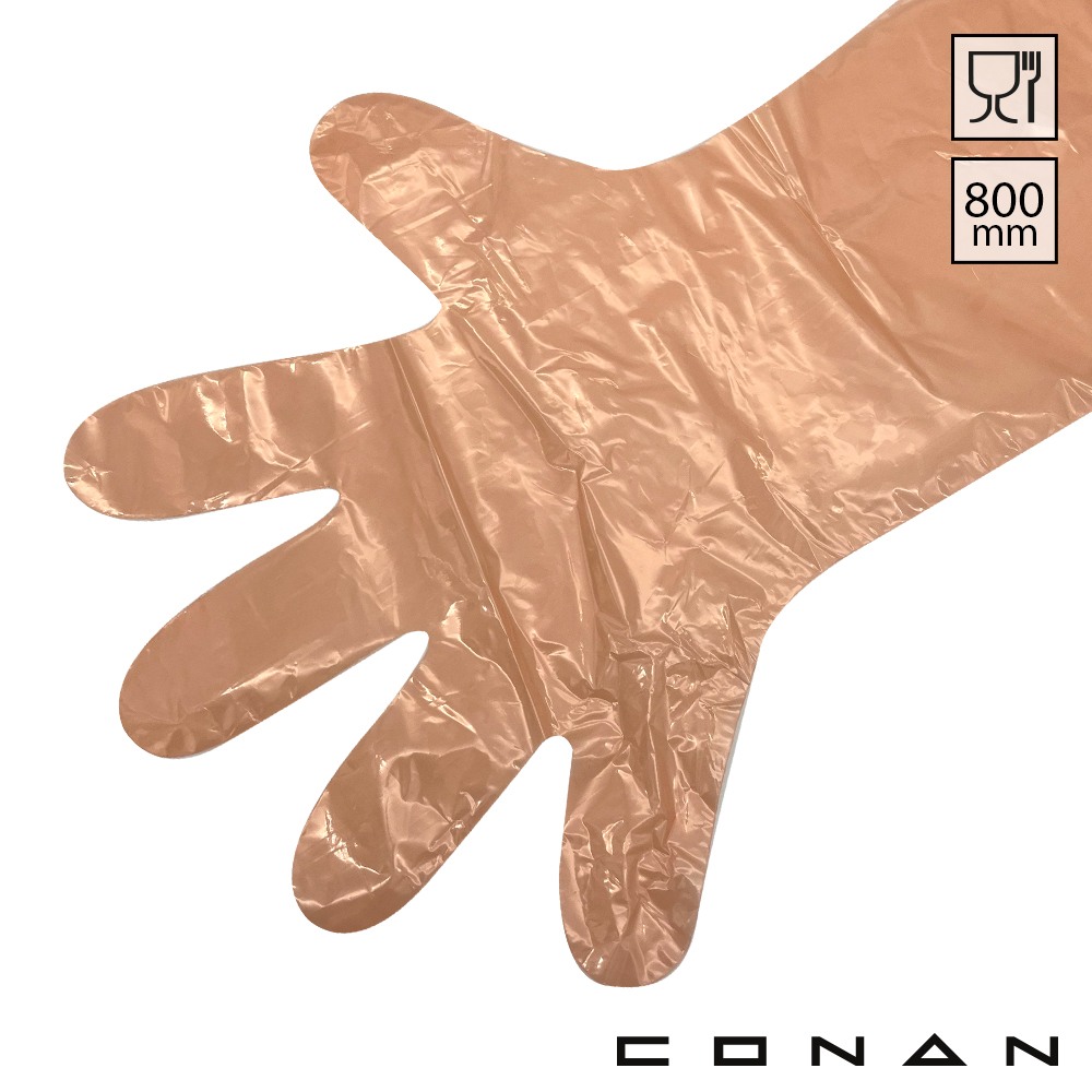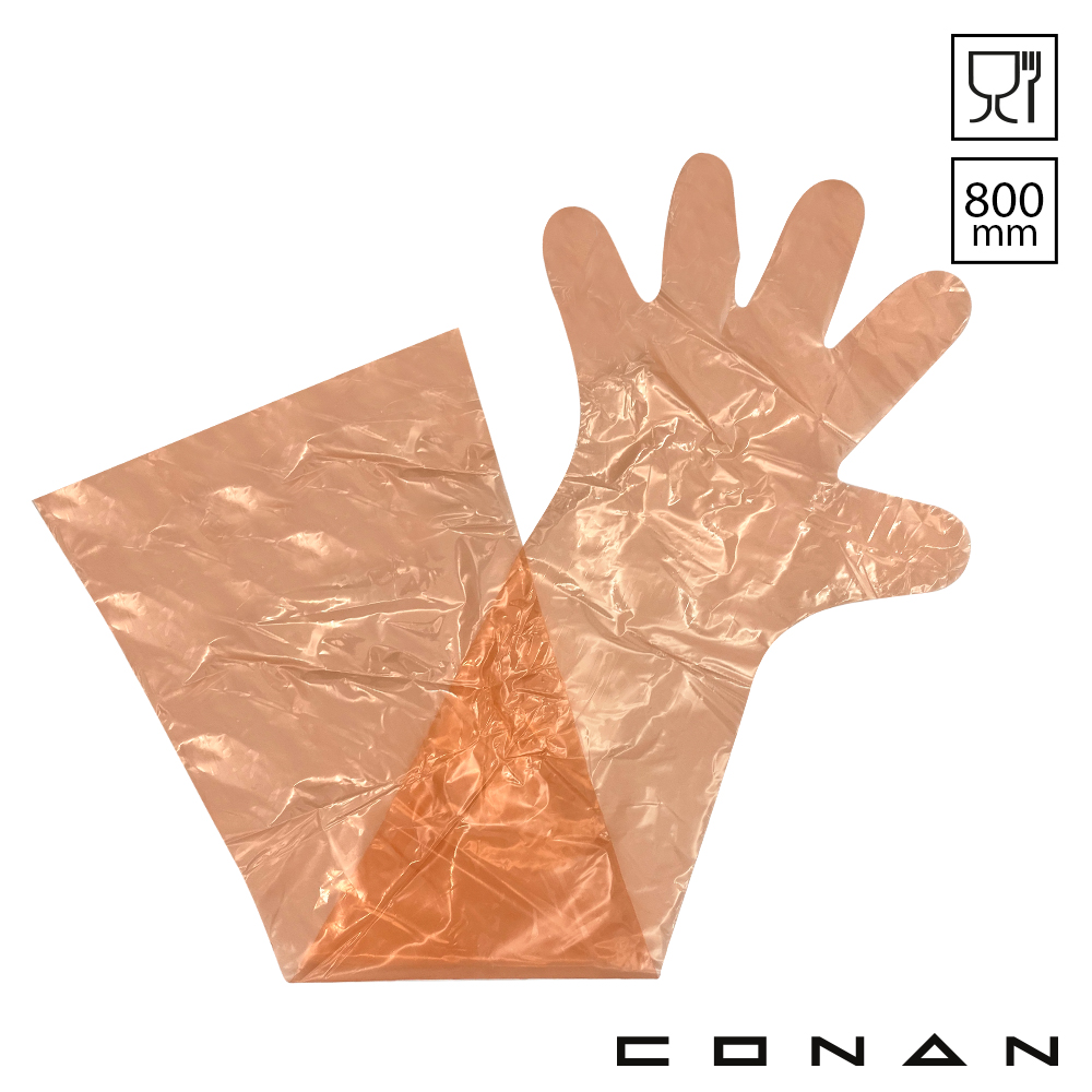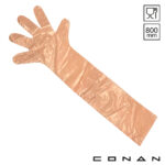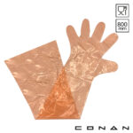 Conan 10-022 Disposable 80 cm lange veterinaire handschoenen gemaakt van oranje gekleurd Lage Dichtheid Polyetheen (LDPE). Dit is een betrouwbare vloeistofdichte handschoen die veel wordt gebruikt in de dierengeneeskunde en door veeartsen. Daarnaast is deze gladde handschoen voor linker- of rechterhand food grade gecertificeerd en beschermt je hand en arm helemaal tot aan je schouder.
