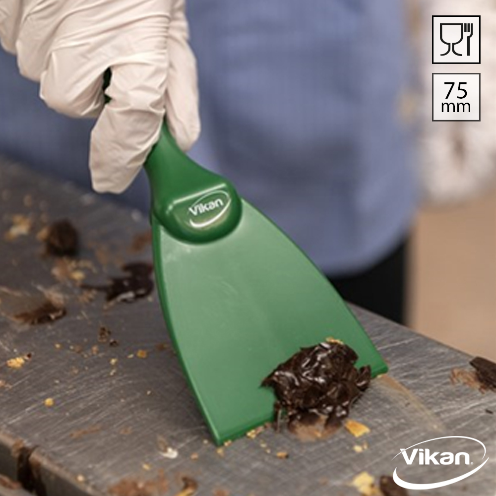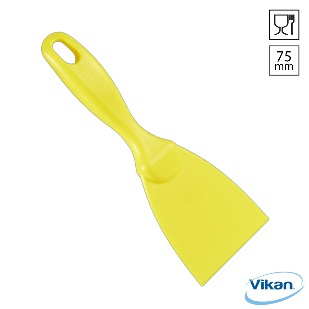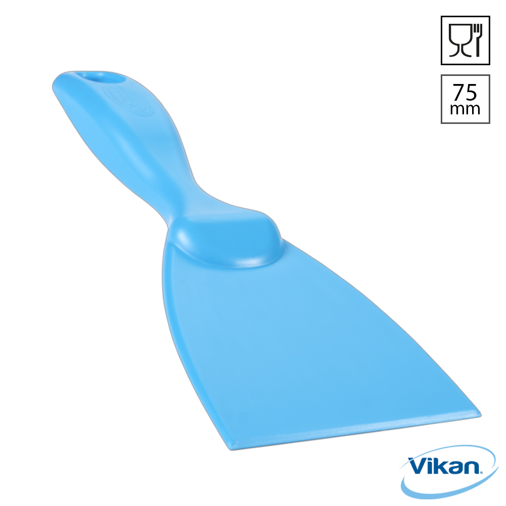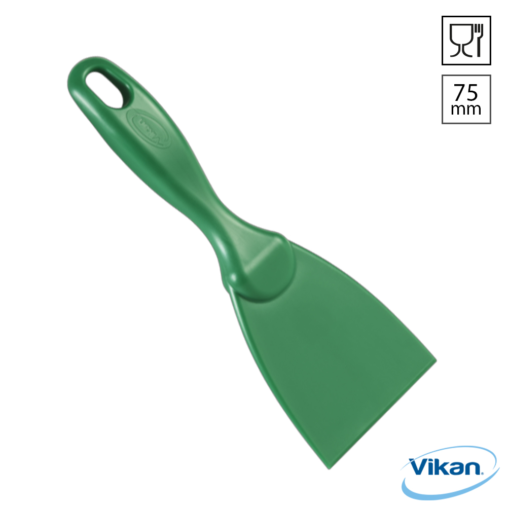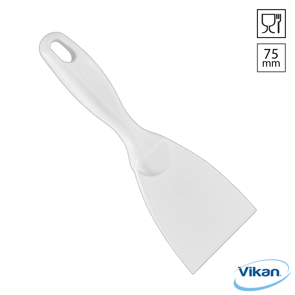 Vikan 4060 handschraper, 75 mm breed, gemaakt van food grade polypropyleen. Deze handspatel is ideaal voor kleine ruimtes en verwijdert moeiteloos hardnekkig vuil, zoals deegresten, chocolade en aangekoekt voedsel in pannen, op harde en krasgevoelige oppervlakken. De Vikan 4060 heeft een lengte van 210 mm en is 3,3 mm dik. Geschikt voor zowel vaatwassers (tot 93 °C) als sterilisatie in een autoclaaf (tot 121 °C).
